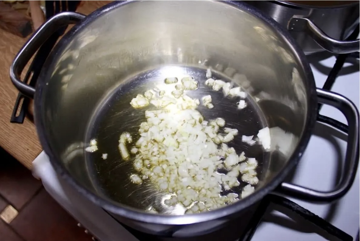 W niedużym garnku rozgrzej oliwę i zeszklij cebulę.