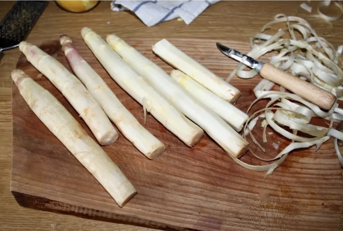 Z białych szparagów odetnij zdrewniałe końcówki, a następnie obierz je.