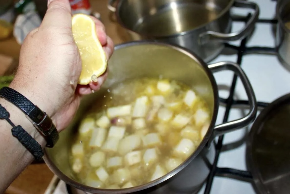 Wlej 800 ml gorącego bulionu, wrzuć ziemniaka i odrobinę startej skórki z cytryny (dowiedz się jak przygotować wywar warzywny).