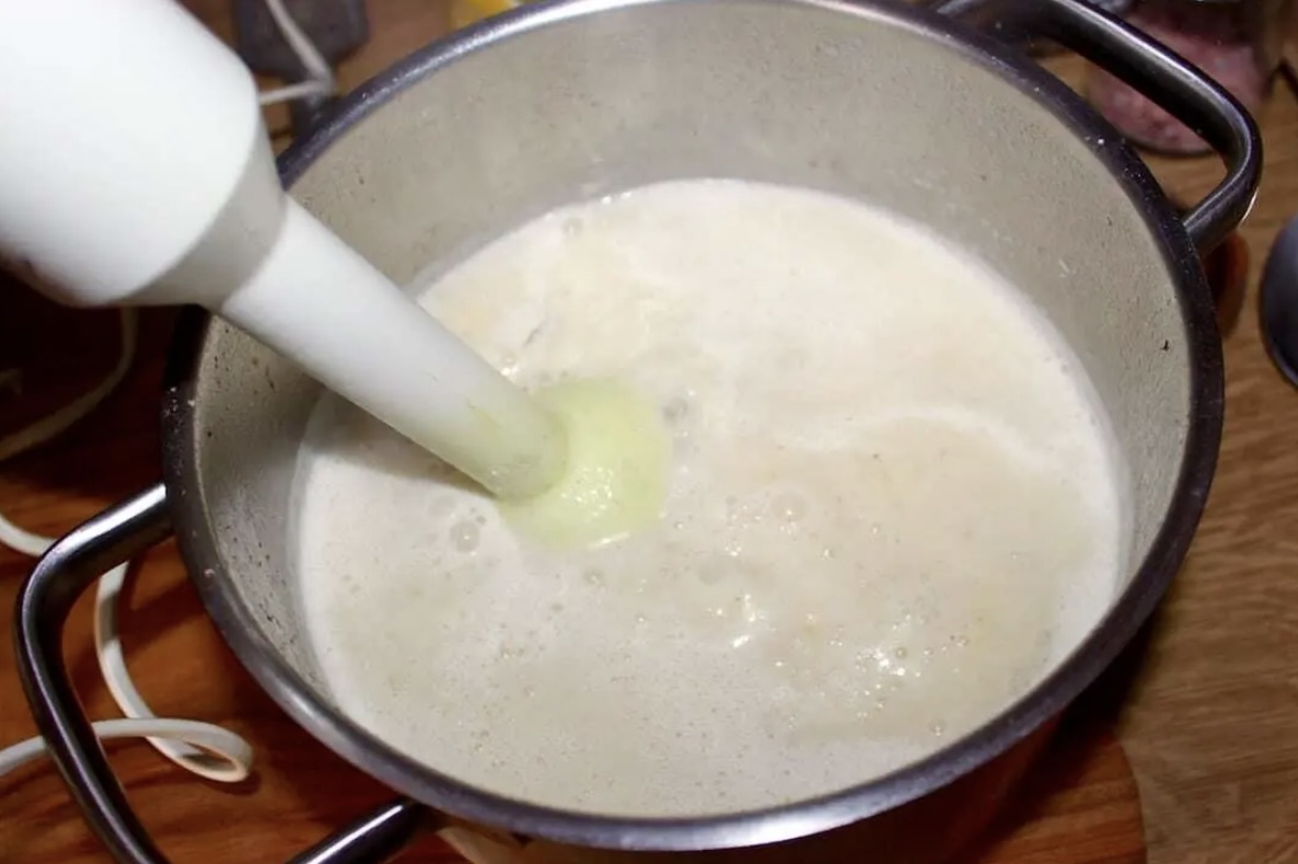 Wyłącz gaz i bardzo dokładnie zmiksuj zupę blenderem, aż stanie się aksamitna i gładka.