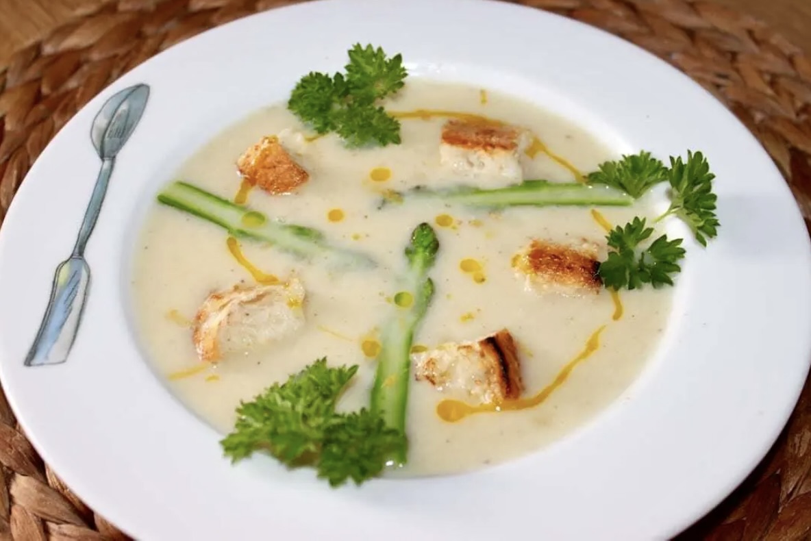 Zupa krem przygotowana z białych szparagów, doprawiona słodką śmietanką, zmiksowana i podana z zielonymi szparagami oraz grzankami.