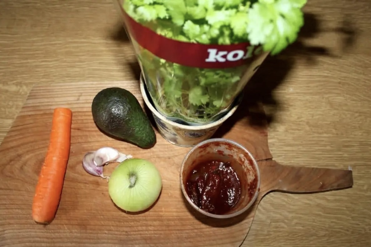 Warzywa: 1 duża marchewka, 1 większa cebula, 2 ząbki czosnku, dojrzałe awokado.