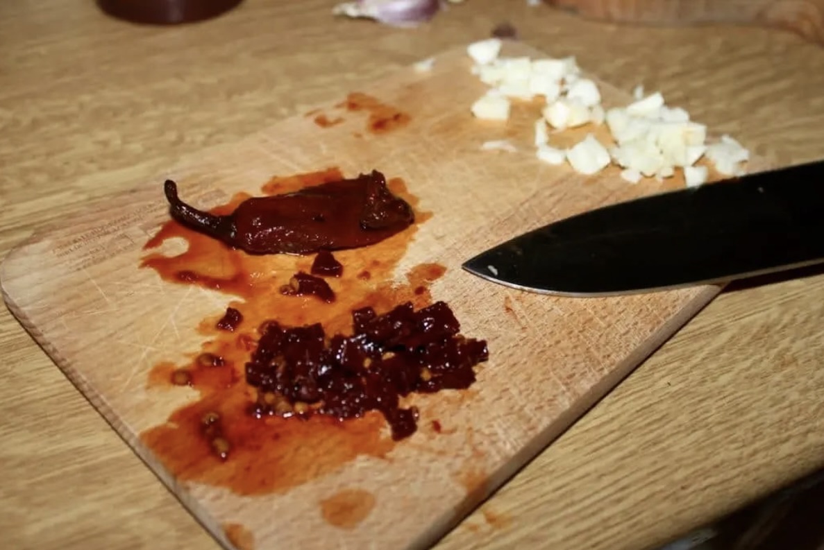 Dodaj chipotle: Z puszki wyjmij 1-2 papryczki chipotle (są bardzo ostre!), drobno je posiekaj, a następnie wrzuć na patelnię wraz z odrobiną sosu adobo z puszki.