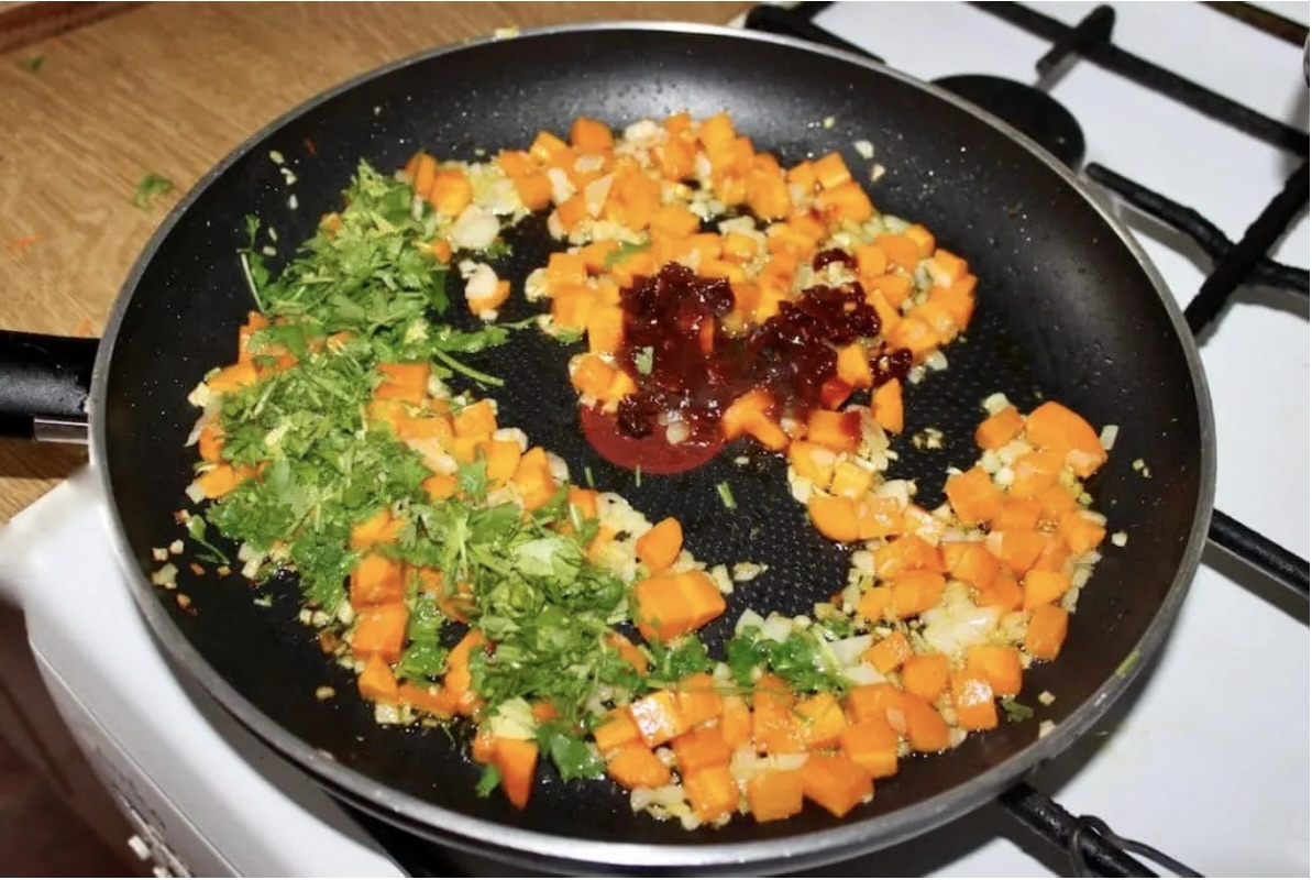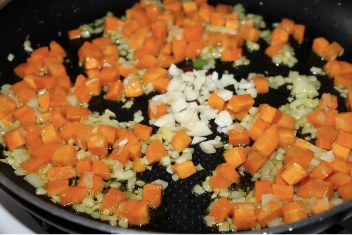 Podsmaż warzywa: Marchewkę i cebulę pokrój w drobną kostkę. Na patelni z odrobiną oliwy podsmażaj je przez kilka minut. Pod koniec dodaj posiekany czosnek, a następnie smaż jeszcze minutę.