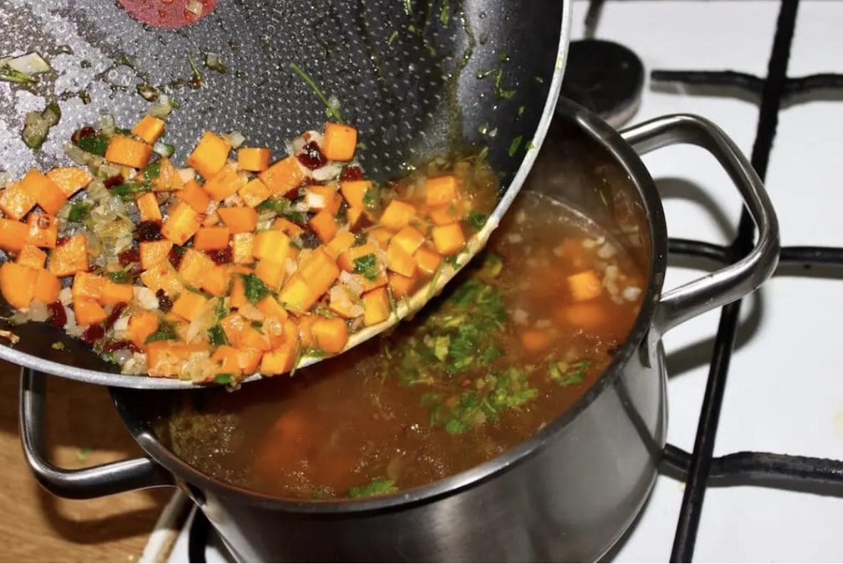 Połącz składniki: Wlej część bulionu na patelnię, dodaj posiekaną kolendrę i wymieszaj. Całą zawartość patelni przelej do garnka z pozostałym bulionem.