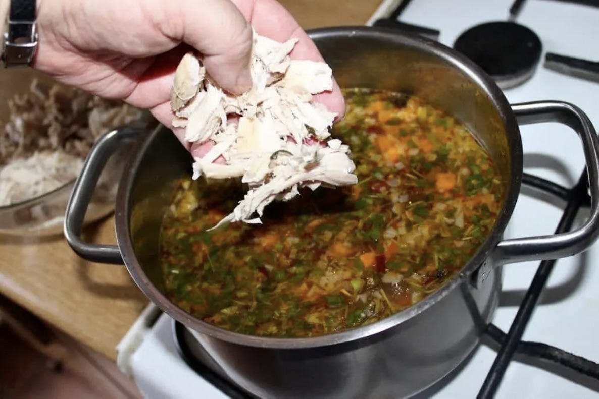 Wykończenie: Ugotowane mięso kurczaka pokrój na kawałki i wrzuć do zupy.