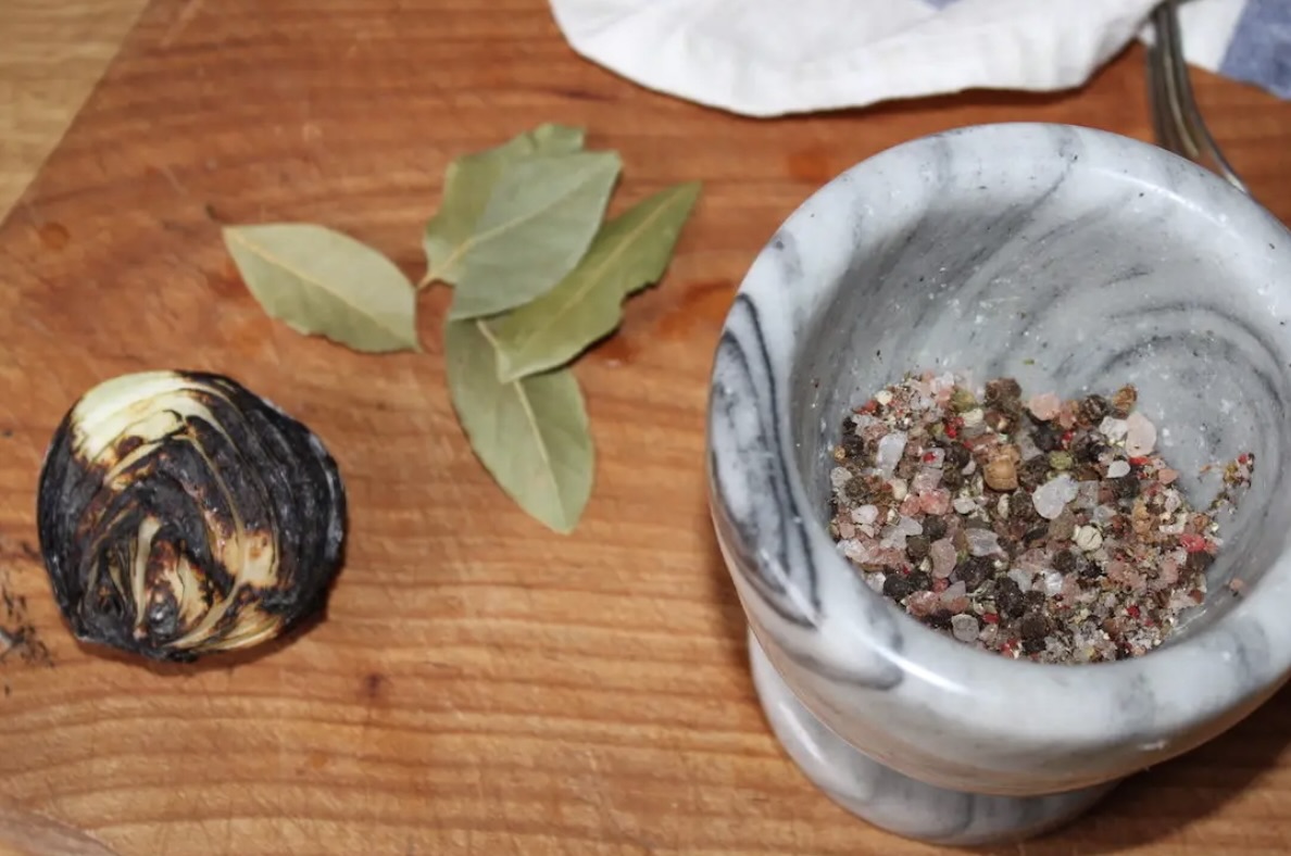 Dodaj włoszczyznę, opaloną cebulę oraz przyprawy (liście laurowe, ziele angielskie i utłuczone w moździerzu pieprz z solą).