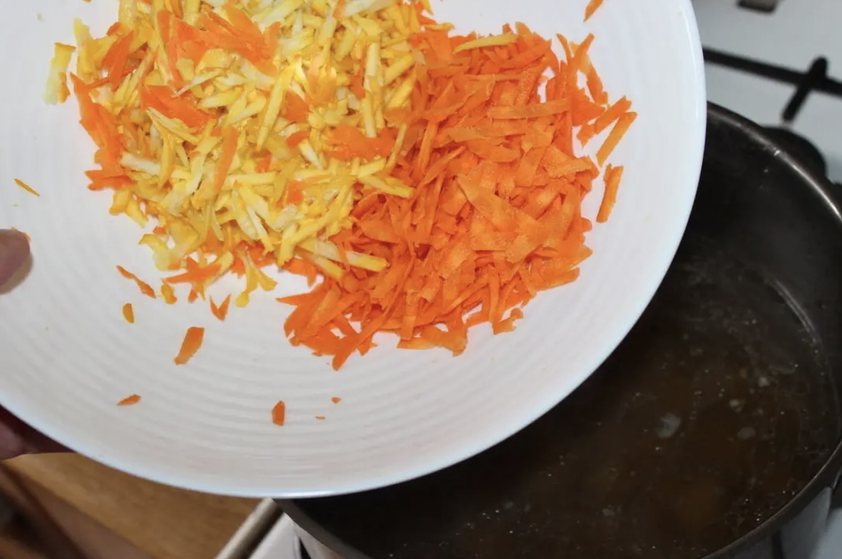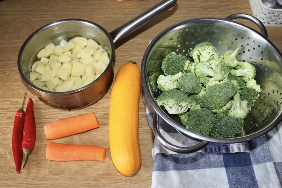 W międzyczasie brokuła podziel na różyczki, ziemniaki pokrój w kostkę, a marchewkę i cukinię zetrzyj na tarce o dużych oczkach.