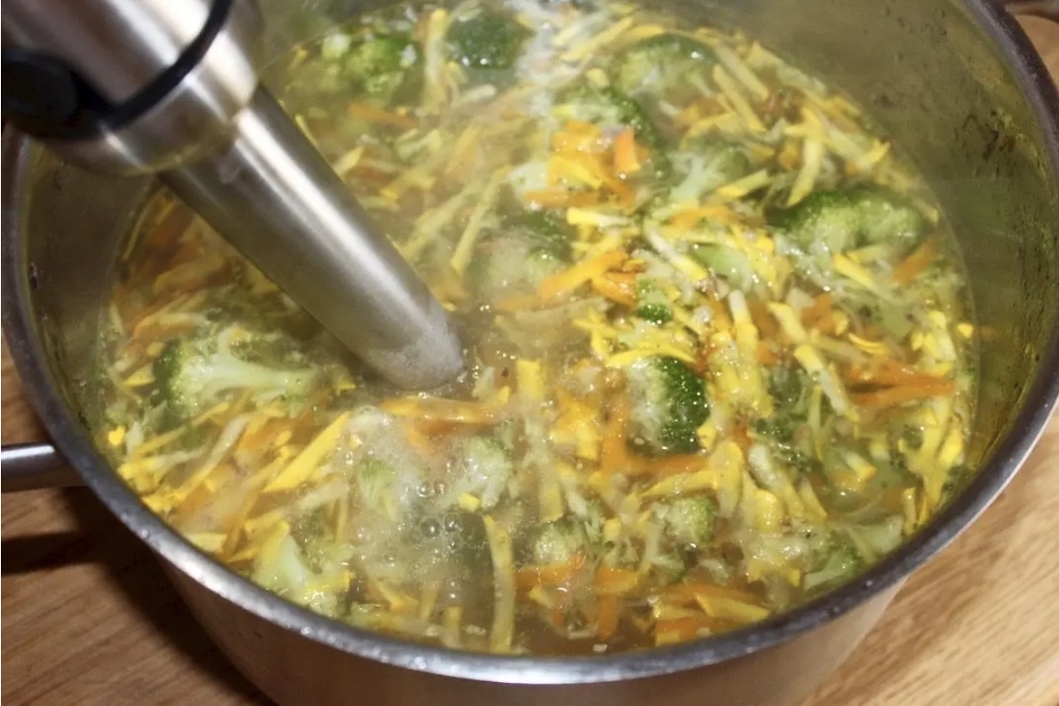 Do gotującego się czystego wywaru wrzuć ziemniaki, a następnie startą marchewkę i cukinię. Na koniec dodaj różyczki brokuła.
