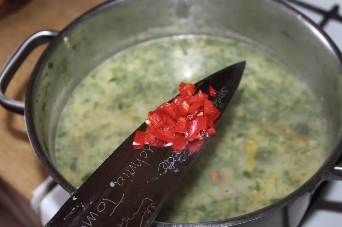 Na koniec dodaj posiekany koperek, natkę pietruszki oraz (opcjonalnie) posiekane chilli.