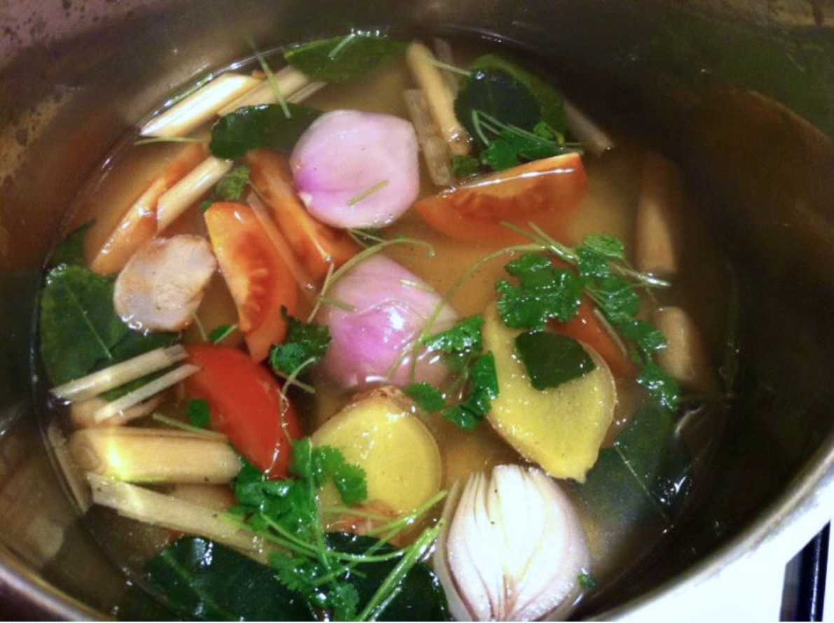 Gotowanie bazy: Do garnka wlej bulion drobiowy. Dodaj liście limonki kaffir, trawę cytrynową, plastry galangalu, świeżą kolendrę, szalotki przekrojone na pół oraz pomidory pokrojone w ćwiartki. Gotuj całość na wolnym ogniu przez około 5 minut.