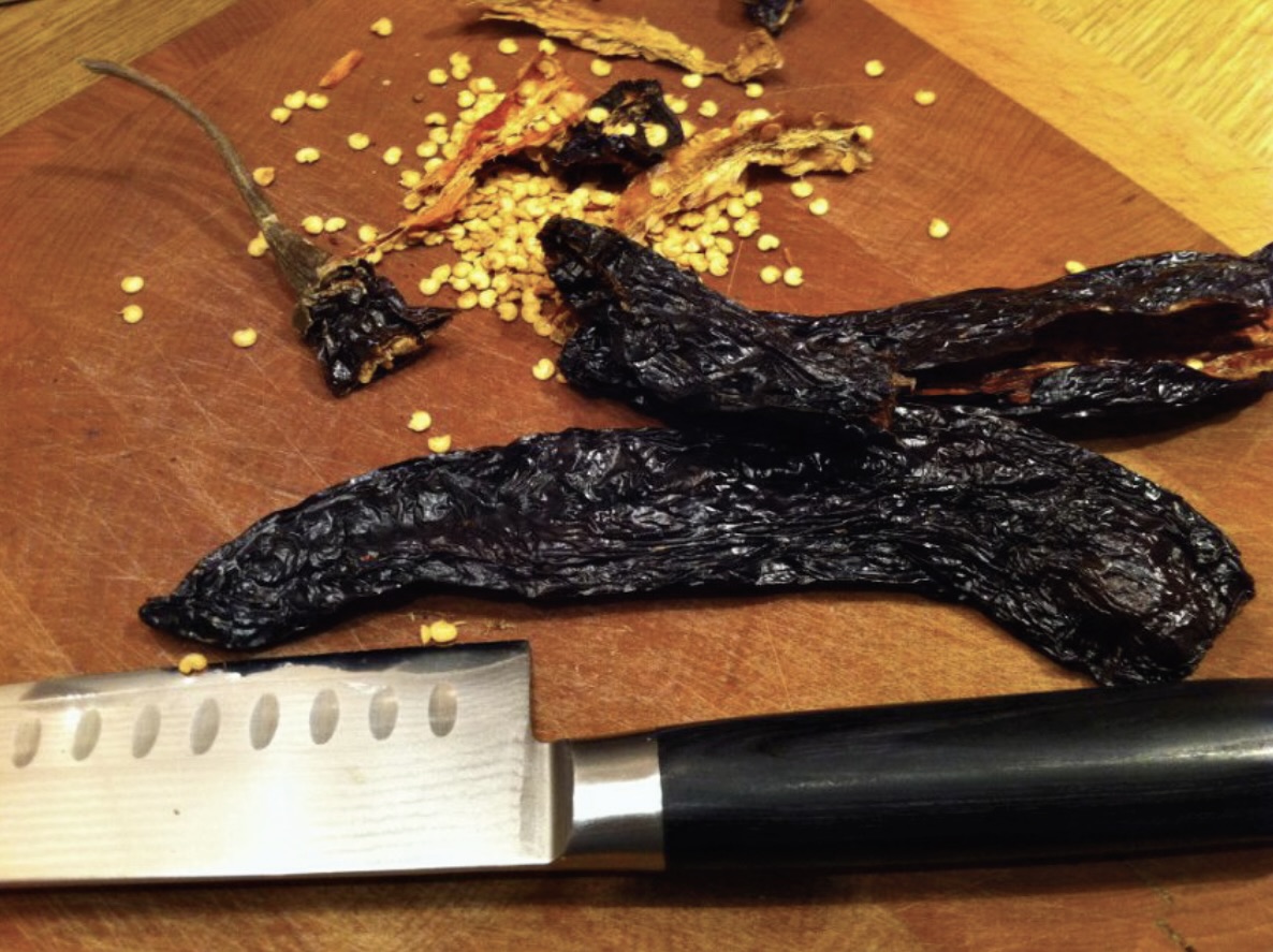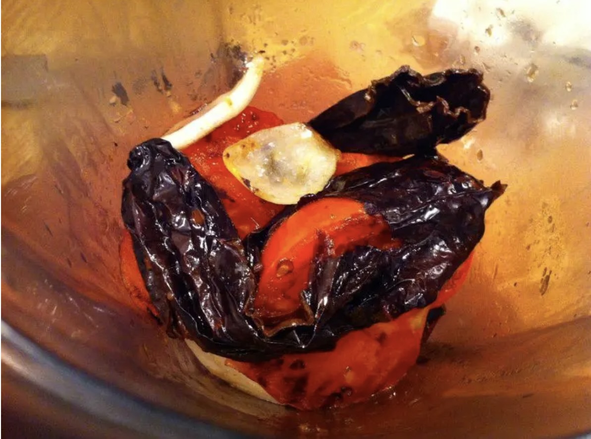 Warzywa: 2-3 suszone papryczki pasilla, 2-3 pomidory, 1 mała cebula (lub pół większej), 2-4 ząbki czosnku.