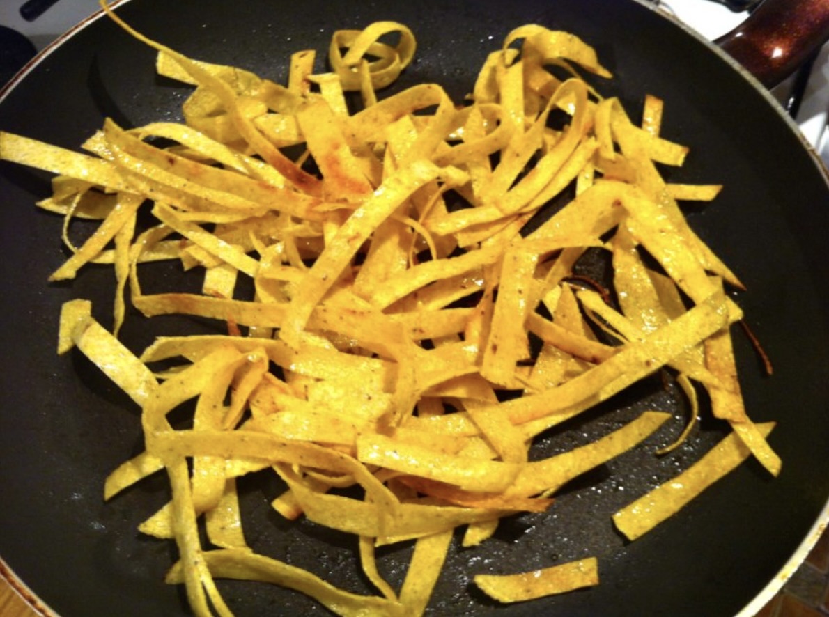 Dodatki (Tortilla): W czasie gdy zupa się gotuje, pokrój tortille w wąskie paski i podsmaż je na oleju na złoty kolor.