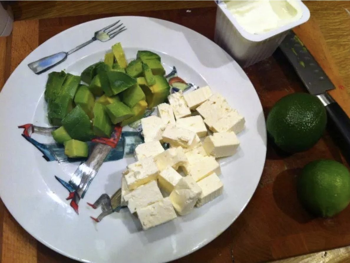 Dodatki: 2-3 tortille kukurydziane, 1 dojrzałe awokado, ser feta, gęsta kwaśna śmietana, 1-2 limonki, świeża kolendra.