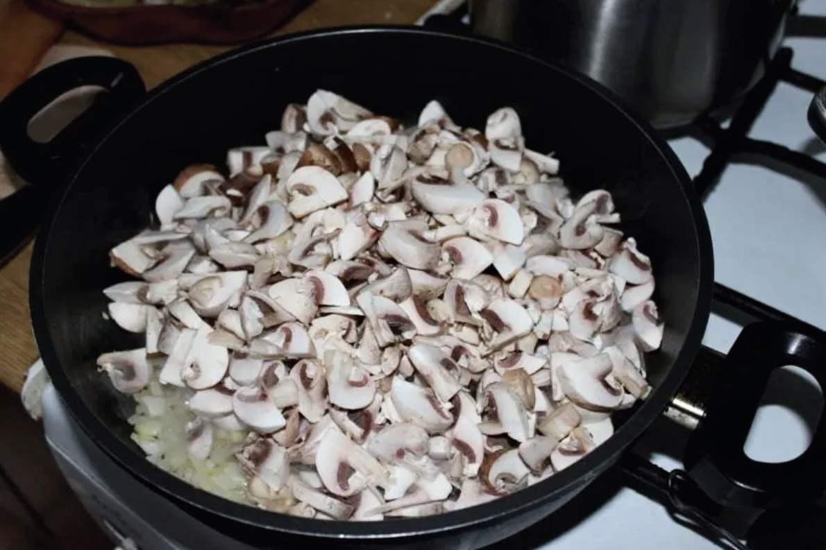 Smażenie pieczarek: Cebulę pokrój w drobną kostkę i zeszklij na oliwie. Pieczarki oczyść, pokrój w plasterki lub ćwiartki, dodaj do cebuli. Dopraw solą oraz pieprzem i smaż przez około 10 minut, mieszając od czasu do czasu.