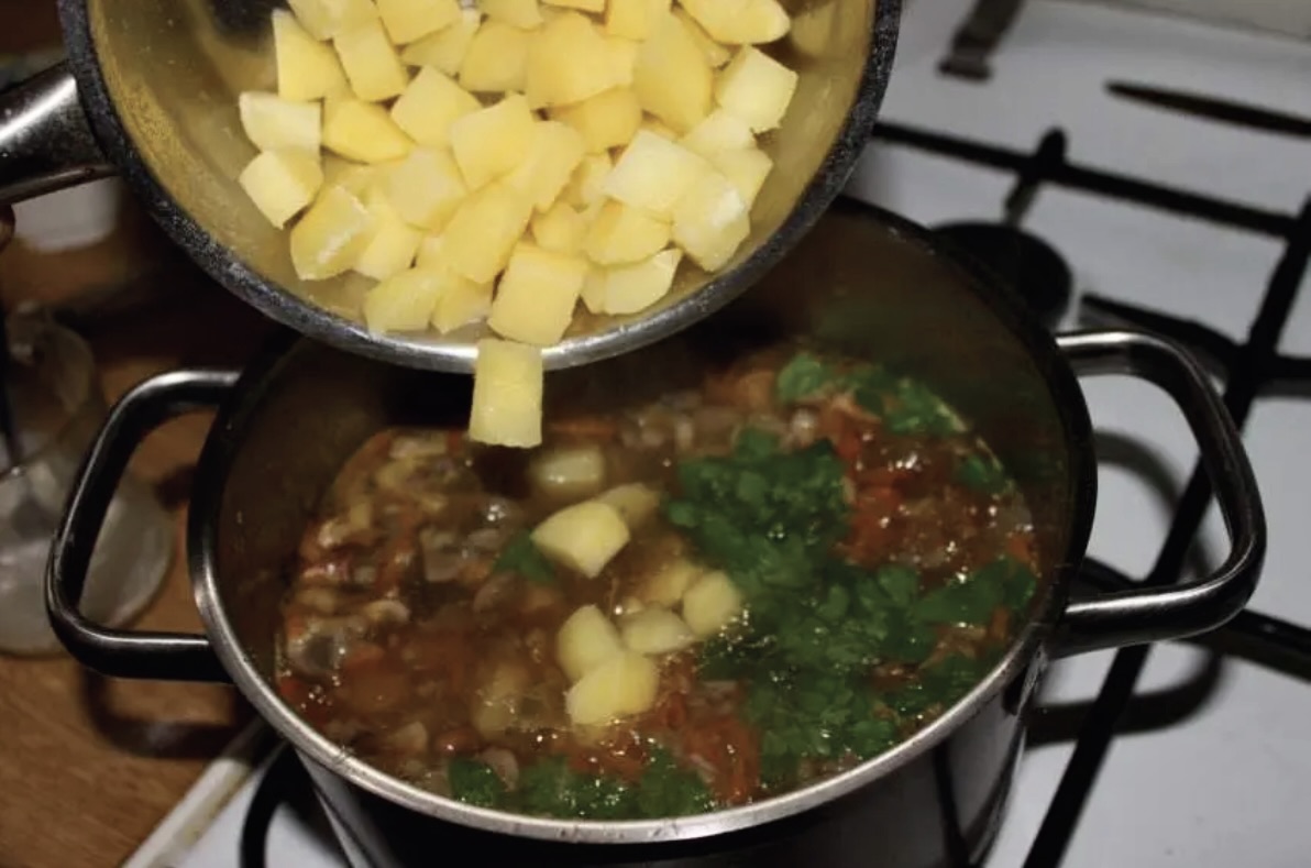 Łączenie składników: Do zupy dodaj posiekaną natkę pietruszki oraz ugotowane wcześniej ziemniaki.
