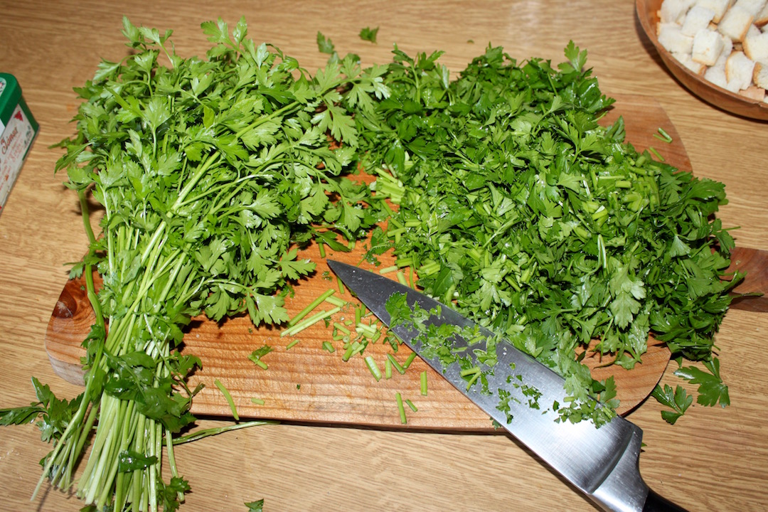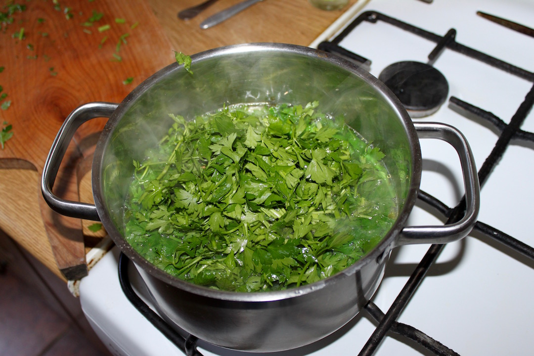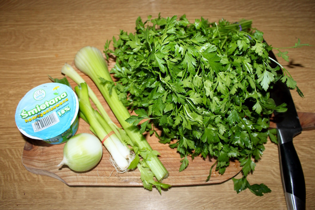 Pietruszka: 2-3 duże pęczki natki pietruszki (lub „ilości zatrważające”).