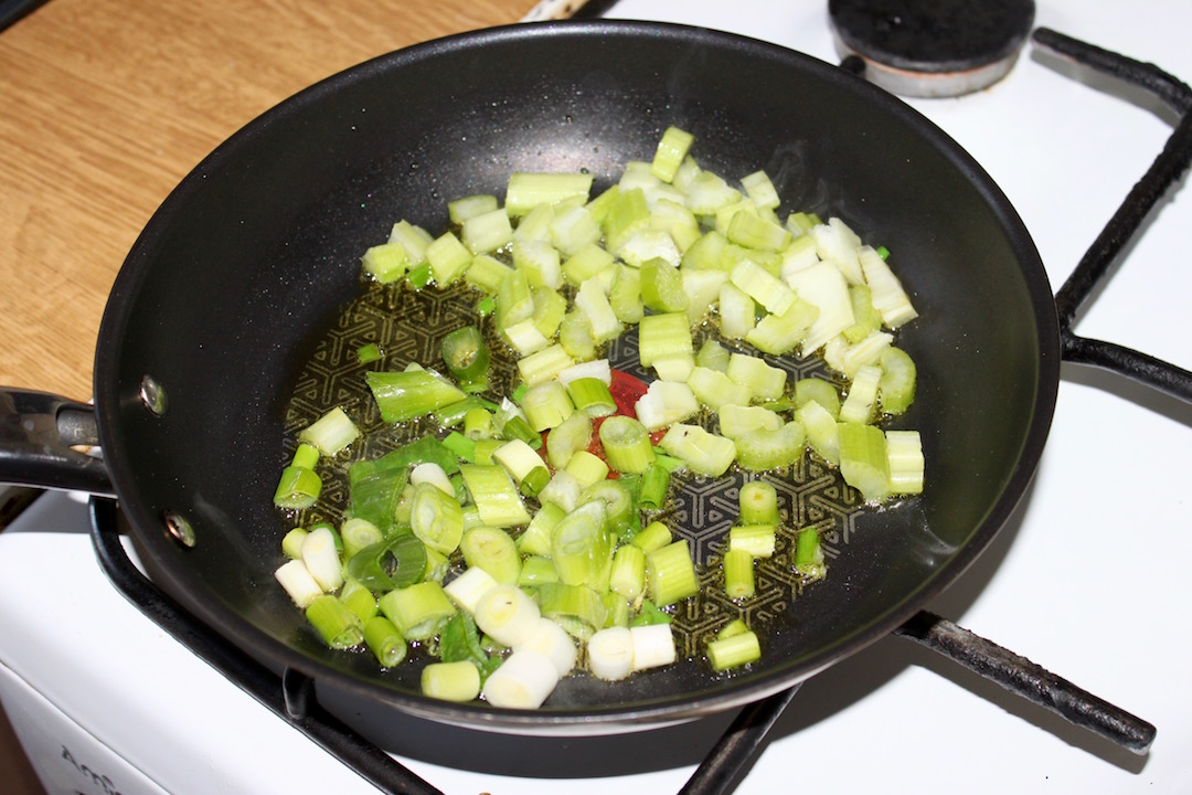 Smażenie bazy: Dymkę i seler naciowy pokrój w nieduże kawałki. Rozgrzej oliwę na patelni, a następnie smaż warzywa na małym ogniu przez około 5 minut, aż zmiękną.