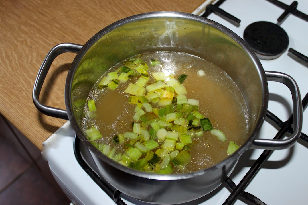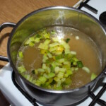 Gotowanie zupy: W garnku zagotuj bulion. Dodaj podsmażony seler i dymkę. Gotuj przez 3 minuty.