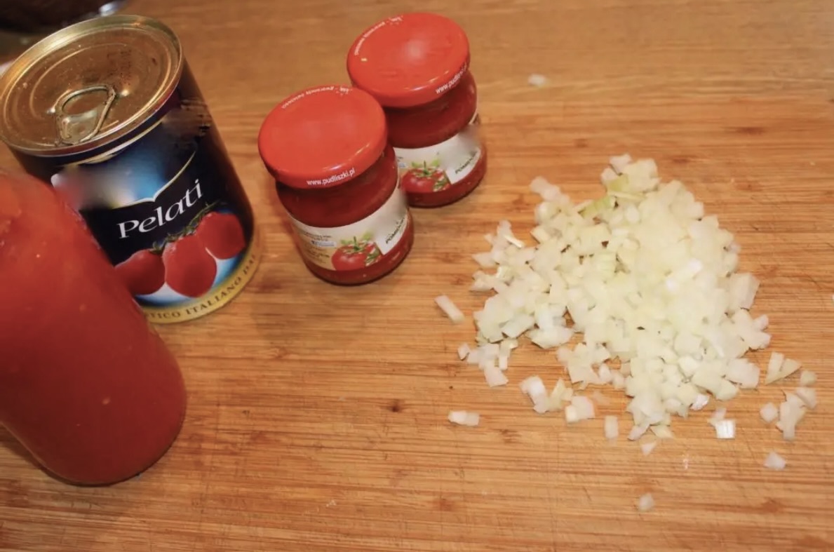 Smażenie bazy: W garnku rozgrzej odrobinę oliwy i zeszklij cebulę pokrojoną w drobną kostkę. Dodaj koncentrat pomidorowy i smaż na małym ogniu przez około 5 minut, często mieszając.