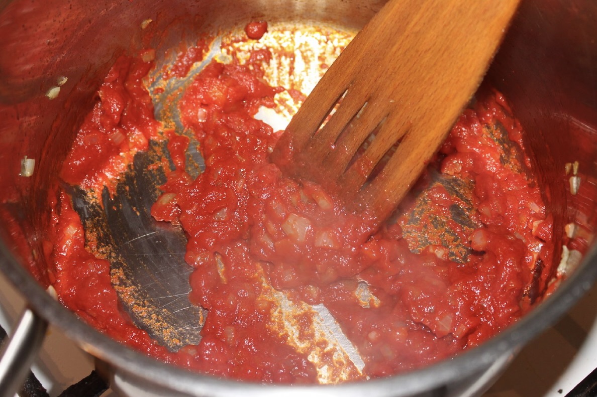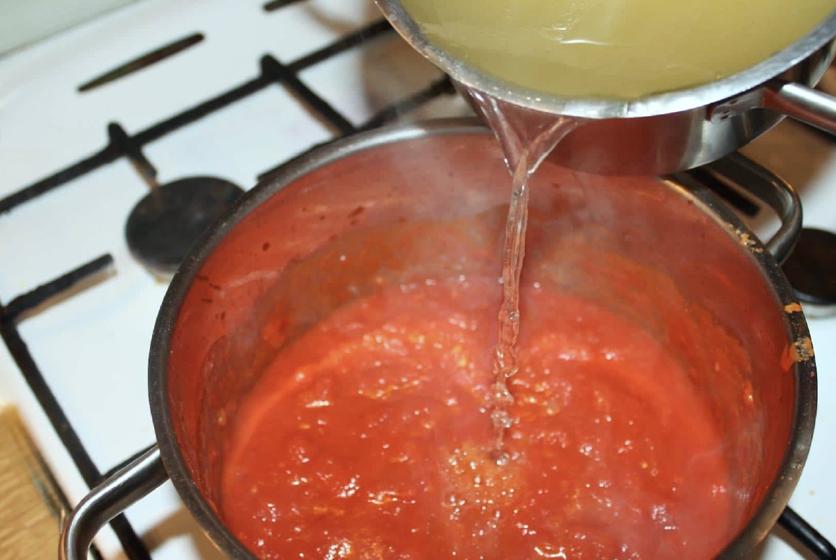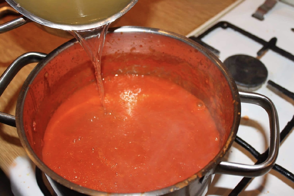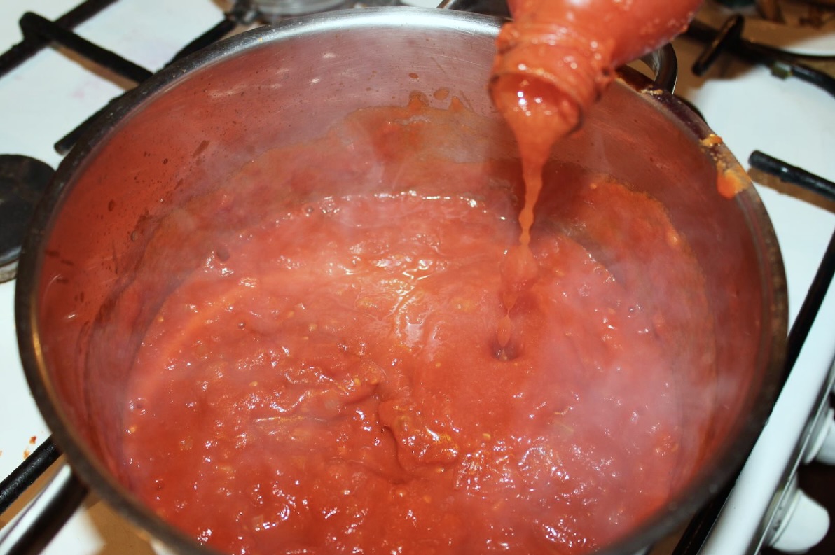 Gotowanie pomidorów: Dodaj pomidory z puszki (rozgnieć je widelcem) lub domowy przecier (przepis na przecier pomidorowy). Wlej odrobinę wywaru i duś całość pod przykryciem przez około 15 minut.