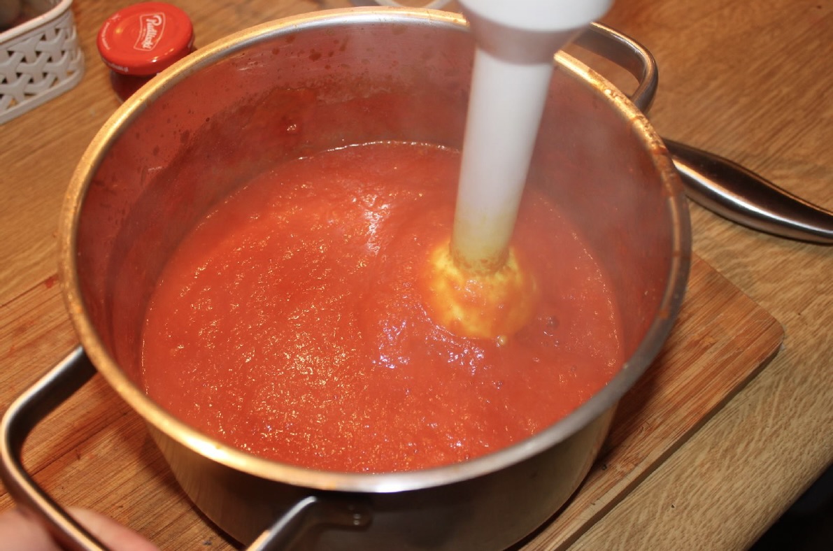 Miksowanie: Zdejmij garnek z ognia i zmiksuj zawartość blenderem na gładką masę.