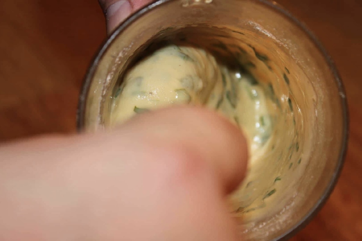 Lane ciasto: W osobnym naczyniu roztrzep jajko z 2 łyżkami mąki, dodaj świeżą bazylię i oregano. Wymieszaj, by nie było grudek.