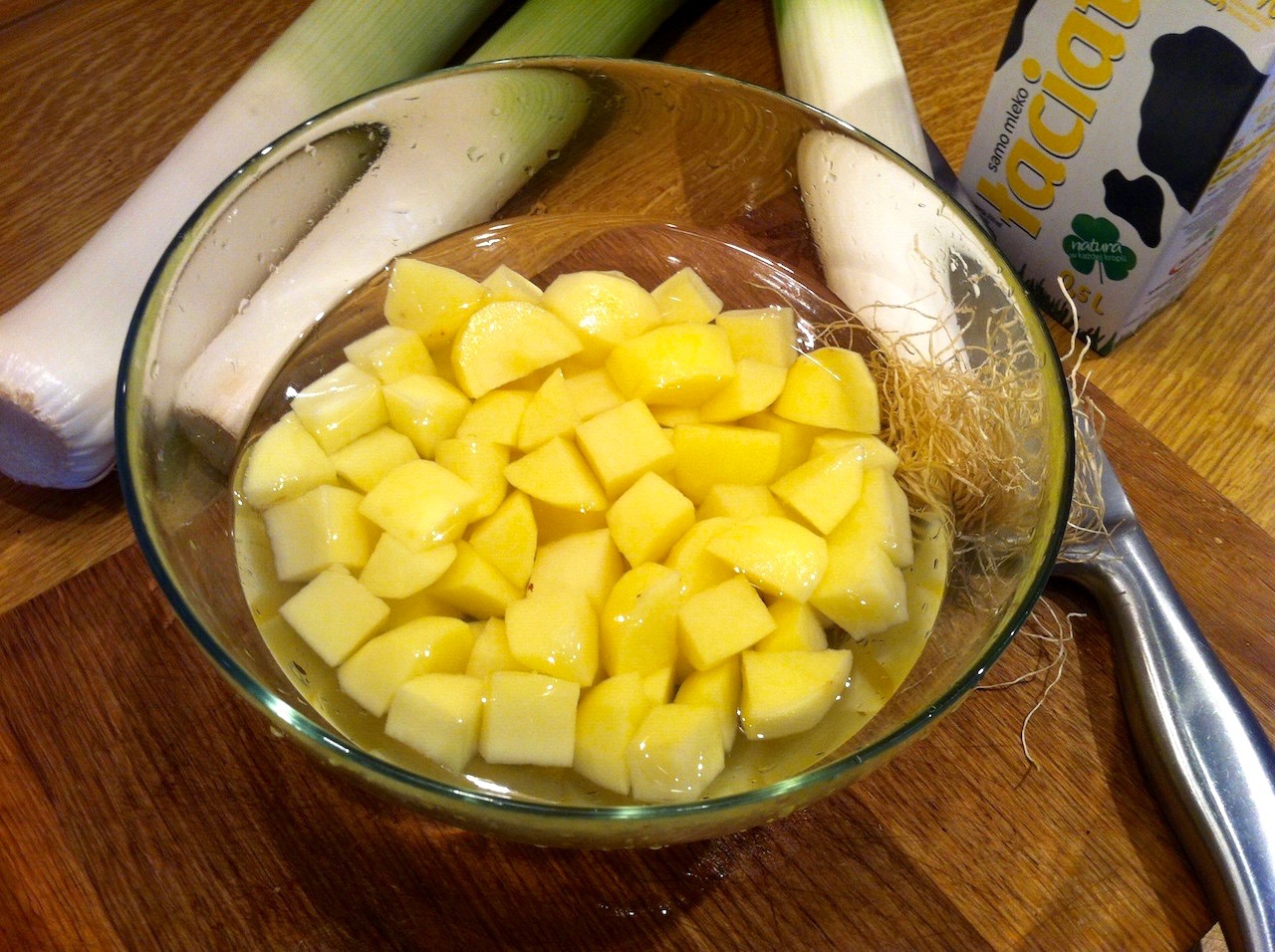Ziemniaki obierz, pokrój w dość drobną kostkę i przechowuj w wodzie do czasu użycia.