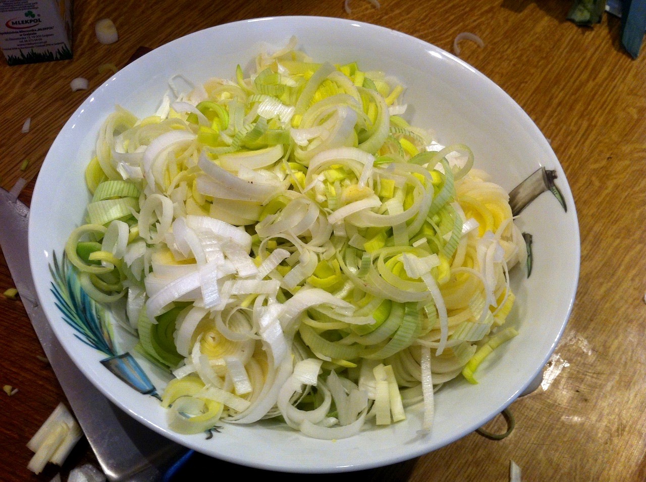 Pory oczyść (usuń ciemnozielone części), przekrój wzdłuż, dokładnie wypłucz i pokrój w cienkie półplasterki.