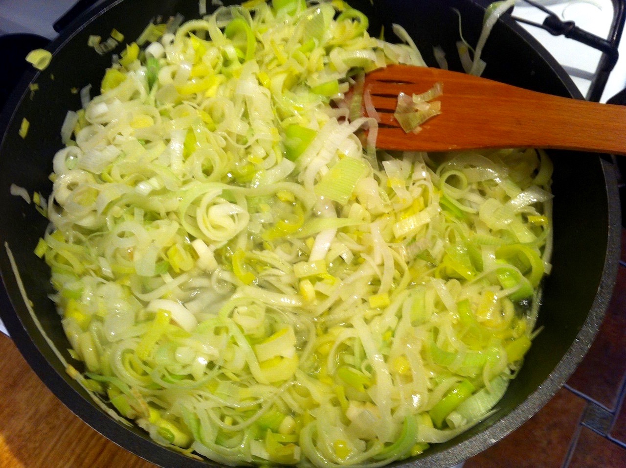 Podduszone pory przełóż do garnka (jeśli dusiłeś je na patelni).