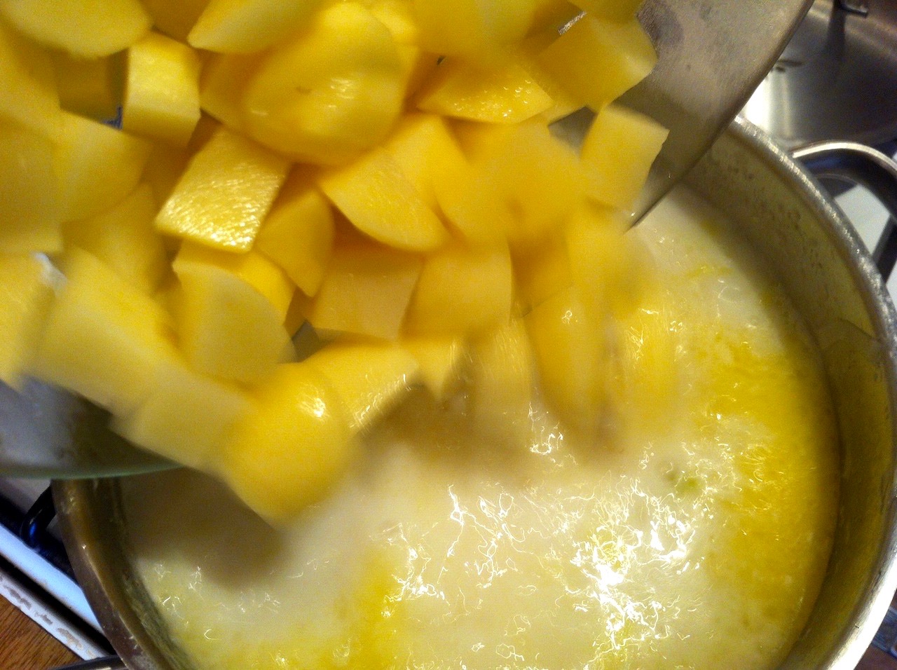 Do zupy dodaj pokrojone ziemniaki.