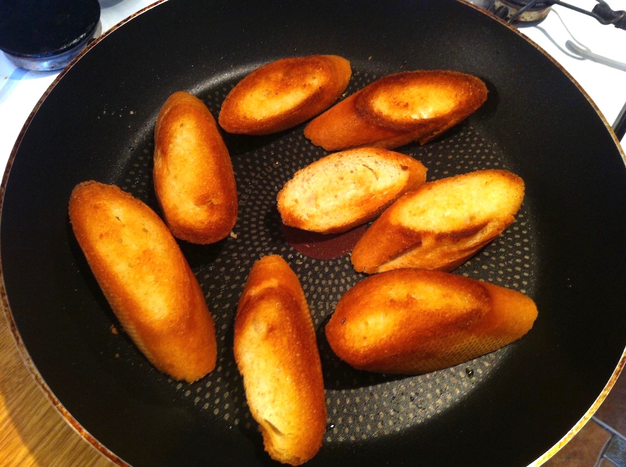 Pokrój bagietkę na kromki i smaż je na wolnym ogniu z obu stron, aż będą złociste i chrupiące.