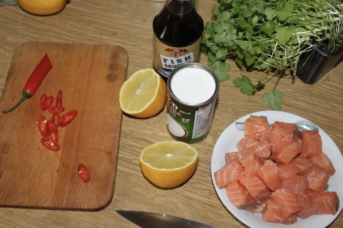 Dodanie łososia i krewetek: Na koniec wrzuć krewetki i pokrojonego w kawałki łososia. Delikatnie zamieszaj i pozostaw na kilka minut, aż krewetki się zagrzeją, a ryba zetnie w gorącej zupie (nie trzeba już gotować, aby łosoś nie był przesuszony).