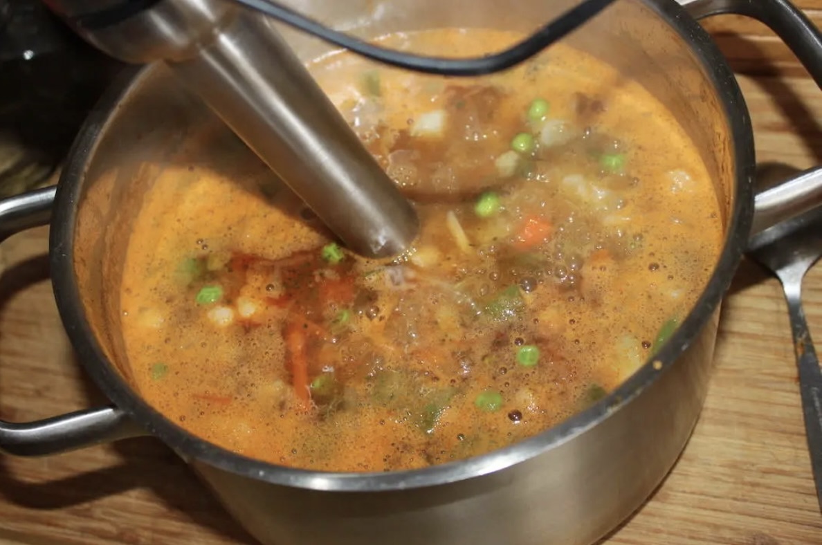 Blendowanie: Gdy warzywa będą miękkie, blenduj zupę krótko, aby tylko część warzyw się zmiksowała. Ma to na celu lekkie zagęszczenie zupy.