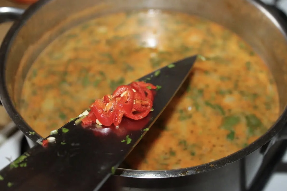 Doprawianie: Dodaj do zupy posiekaną świeżą kolendrę, wyciśnij sok z cytryny (lub limonki) do smaku i dopraw sosem rybnym. Wsyp również nieco posiekanej czerwonej ostrej papryczki chilli.