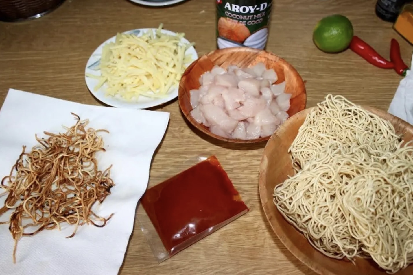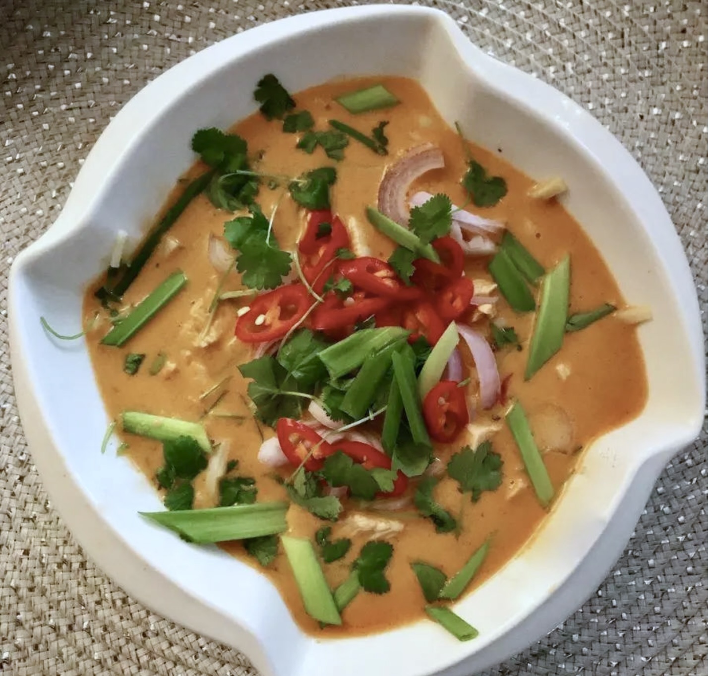 Zupa ta jest przygotowana na bazie bulionu drobiowego z dodatkiem kurczaka, pasty curry i mleczka kokosowego, z wyraźnie ostrą nutą dzięki chilli.