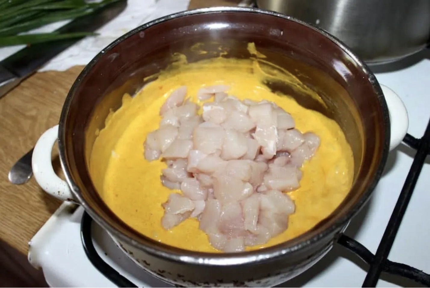 Wrzuć do zupy pokrojone w kostkę piersi kurczaka.