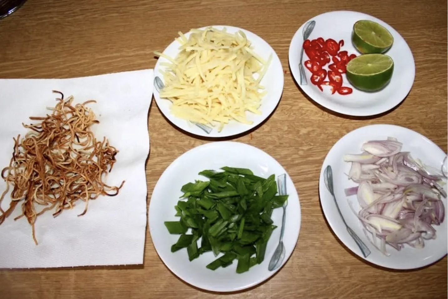 Przygotuj dodatki: posiekaj dymkę, pokrój chilli, posiekaj szalotkę w piórka, przygotuj limonkę. Świeża kolendra jest niezbędna.