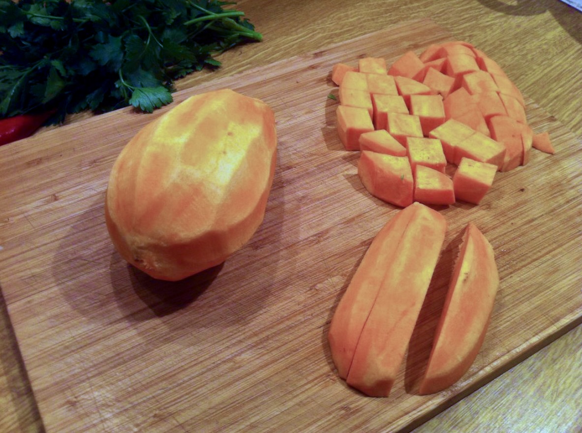 Bataty obierz i pokrój w kostkę. Pamiętaj, aby kawałki batatów były drobniejsze niż marchewki. Chodzi o to, aby po ugotowaniu bataty były miękkie, a marchewka pozostała „al dente” (zapewni to lepszą konsystencję zupy po zmiksowaniu).