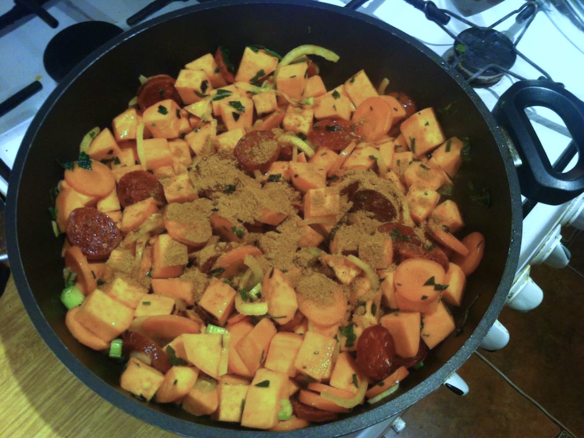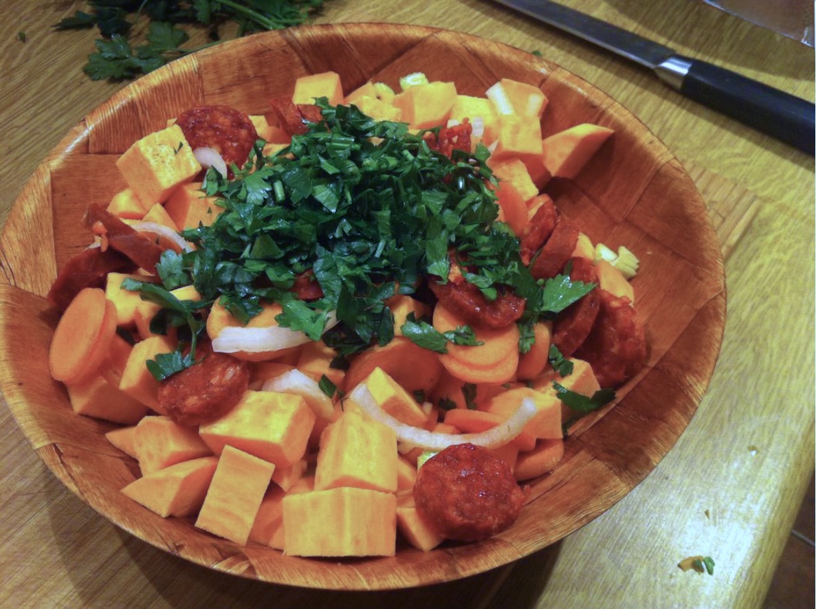 Aromatyczna zupa-krem, szybka i sycąca, z charakterystyczną słodyczą batatów i pikantnym akcentem chorizo.