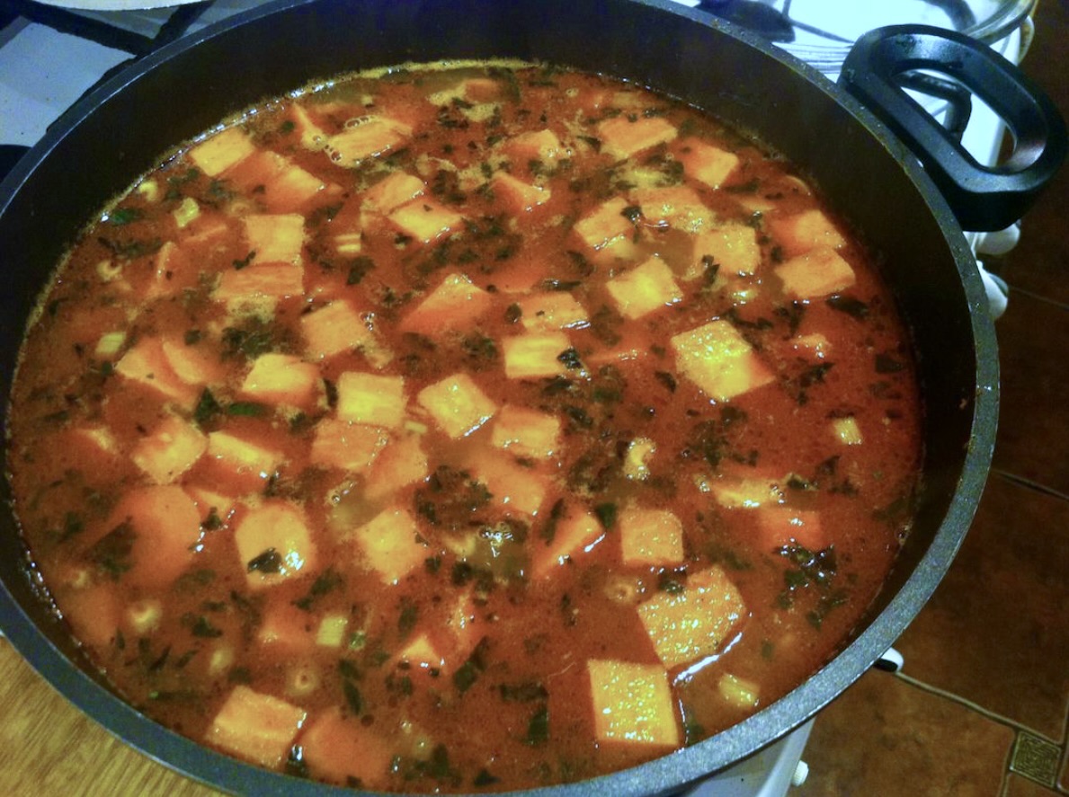 Następnie wlej bulion warzywny, przykryj naczynie pokrywką i gotuj przez około 10 minut, aż bataty będą miękkie.
