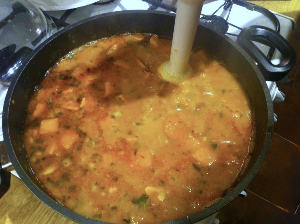Wrzuć do zupy pozostałą świeżą kolendrę i zmiksuj całość blenderem. Sugeruję miksowanie „na grubo”, aby kawałki chorizo pozostały wyczuwalne.