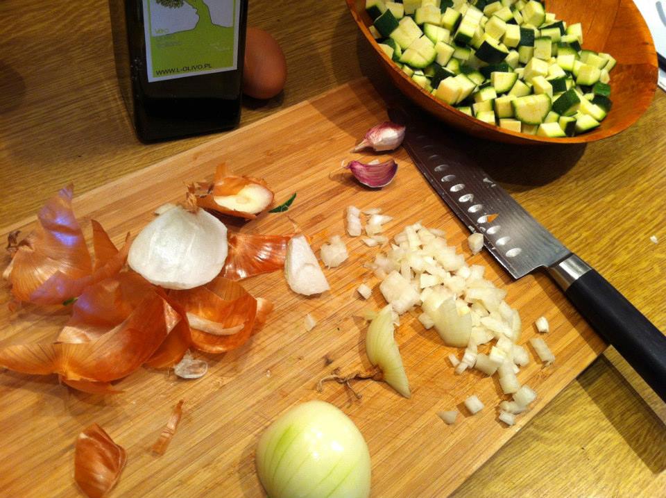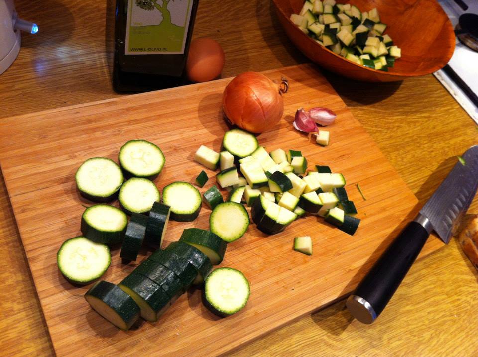 Cukinie umyj, osusz i pokrój w dość małą kostkę. Nie musisz ich obierać.