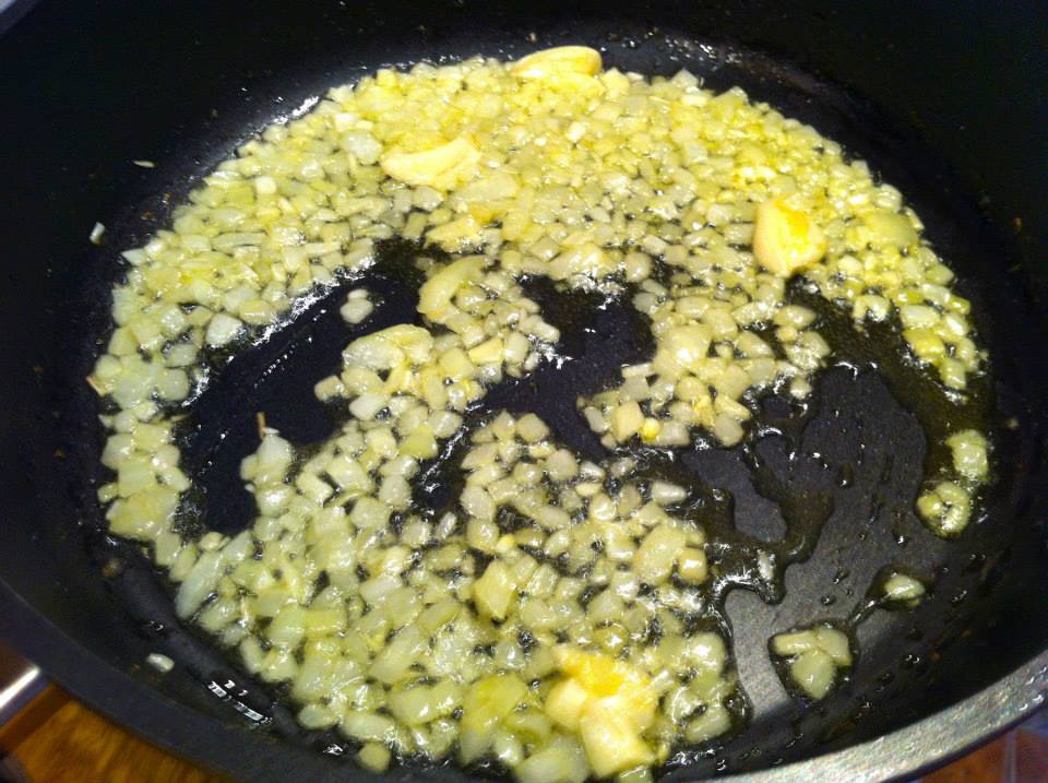 Na dużej patelni rozgrzej oliwę i wrzuć cebulę. Smaż chwilę, aż się zeszkli.