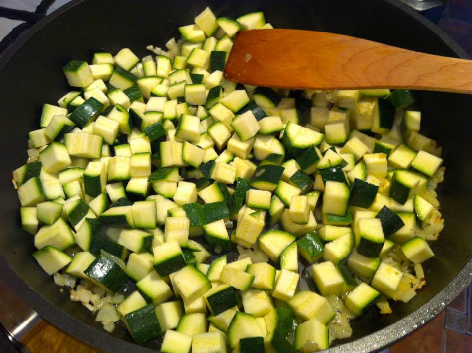 Następnie dodaj czosnek, a po chwili wrzuć pokrojoną cukinię.
