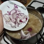 Cebula: Dodaj obraną i grubo posiekaną czerwoną cebulę. Gotuj całość przez kolejne 5 minut.