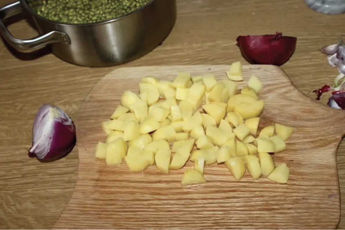 Podsmażanie: Na patelni rozgrzej oliwę. Wrzuć namoczoną fasolę oraz pokrojone ziemniaki. Smaż przez kilka minut, mieszając.