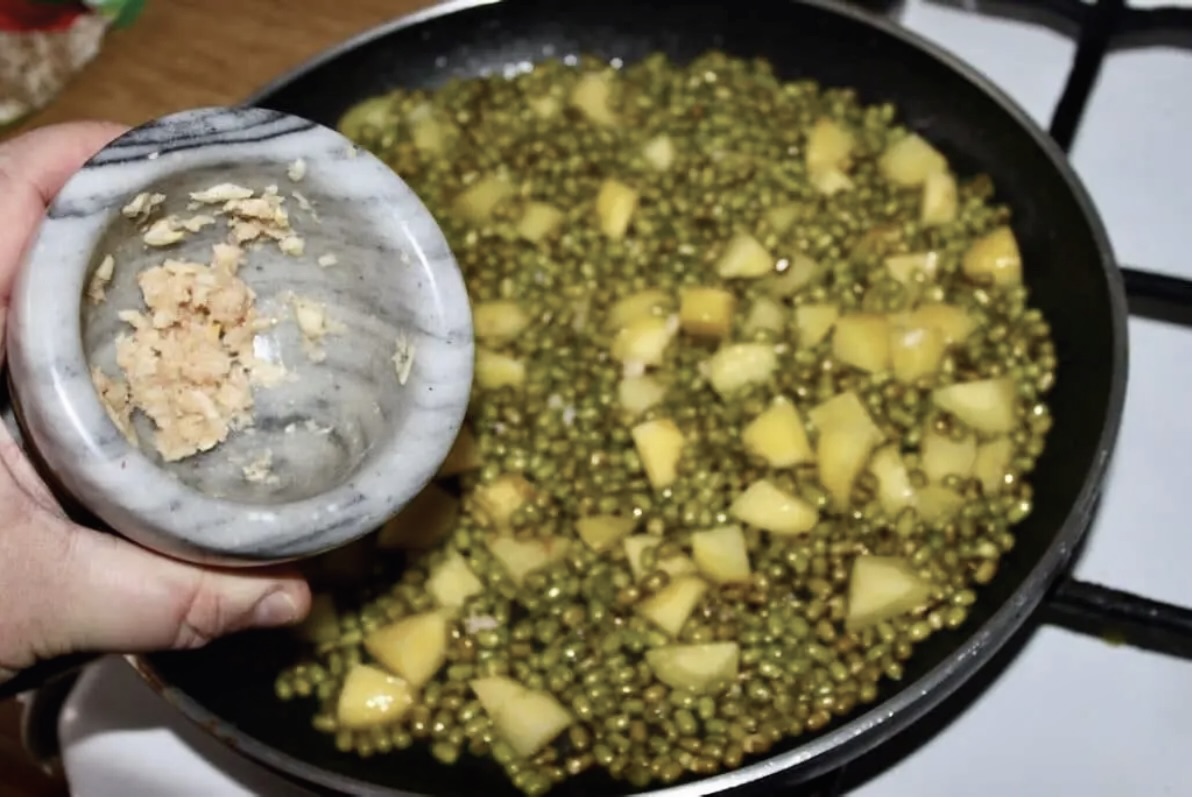 Doprawianie: Warzywa na patelni posyp mielonym kminkiem (1–2 łyżeczki) oraz pieprzem. Dodaj pastę czosnkową, wymieszaj i smaż jeszcze chwilę.