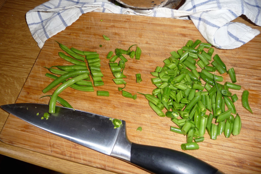 Oczyszczoną fasolkę przepłucz pod bieżącą wodą, odcedź, a następnie posiekaj na około dwucentymetrowe kawałki.