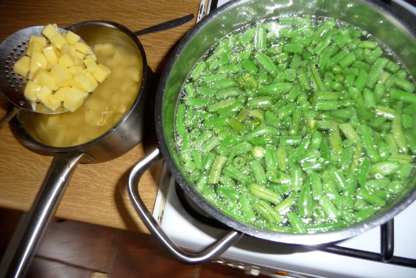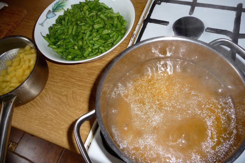 Do garnka z wywarem wrzuć fasolkę i pokrojone ziemniaki.